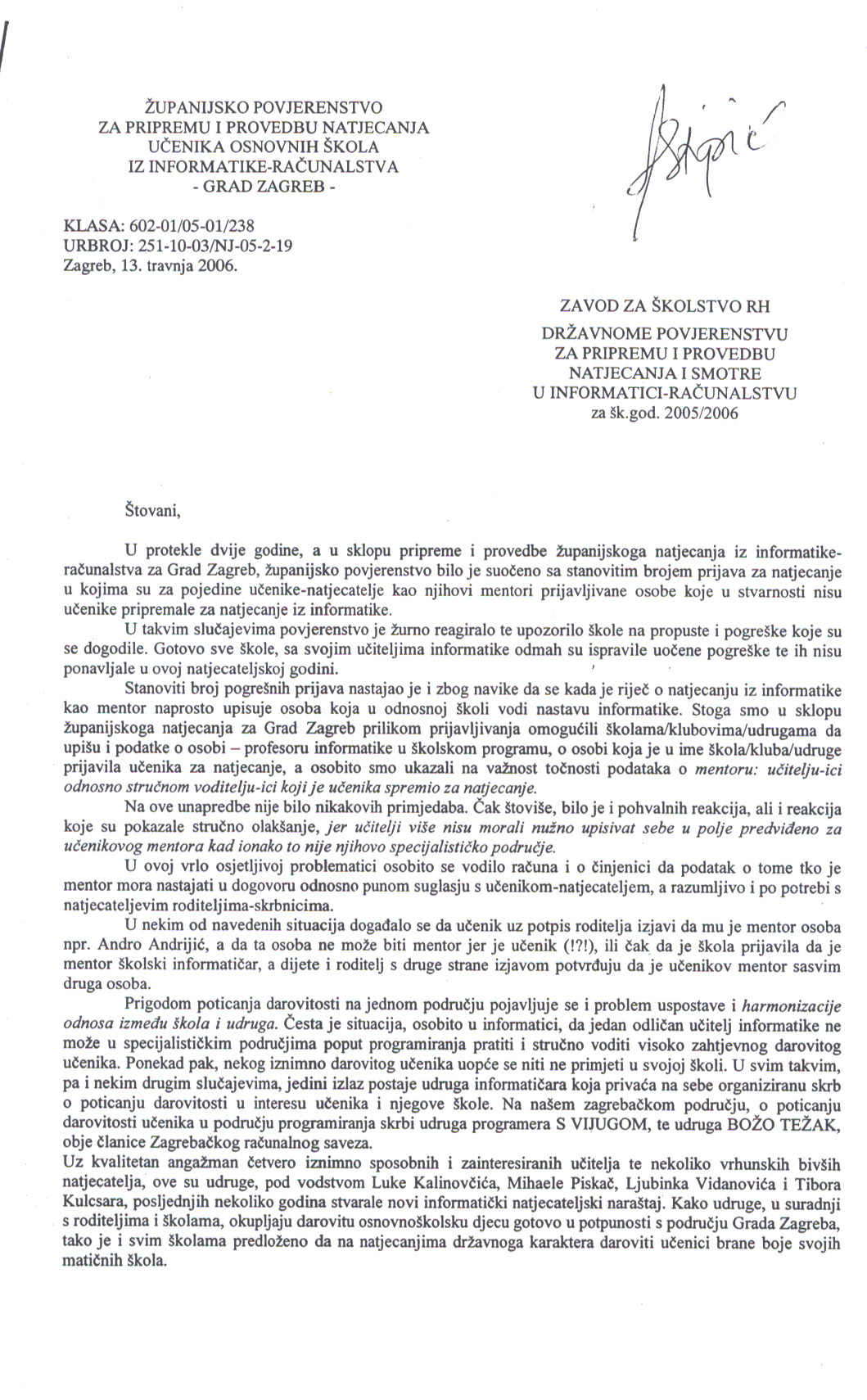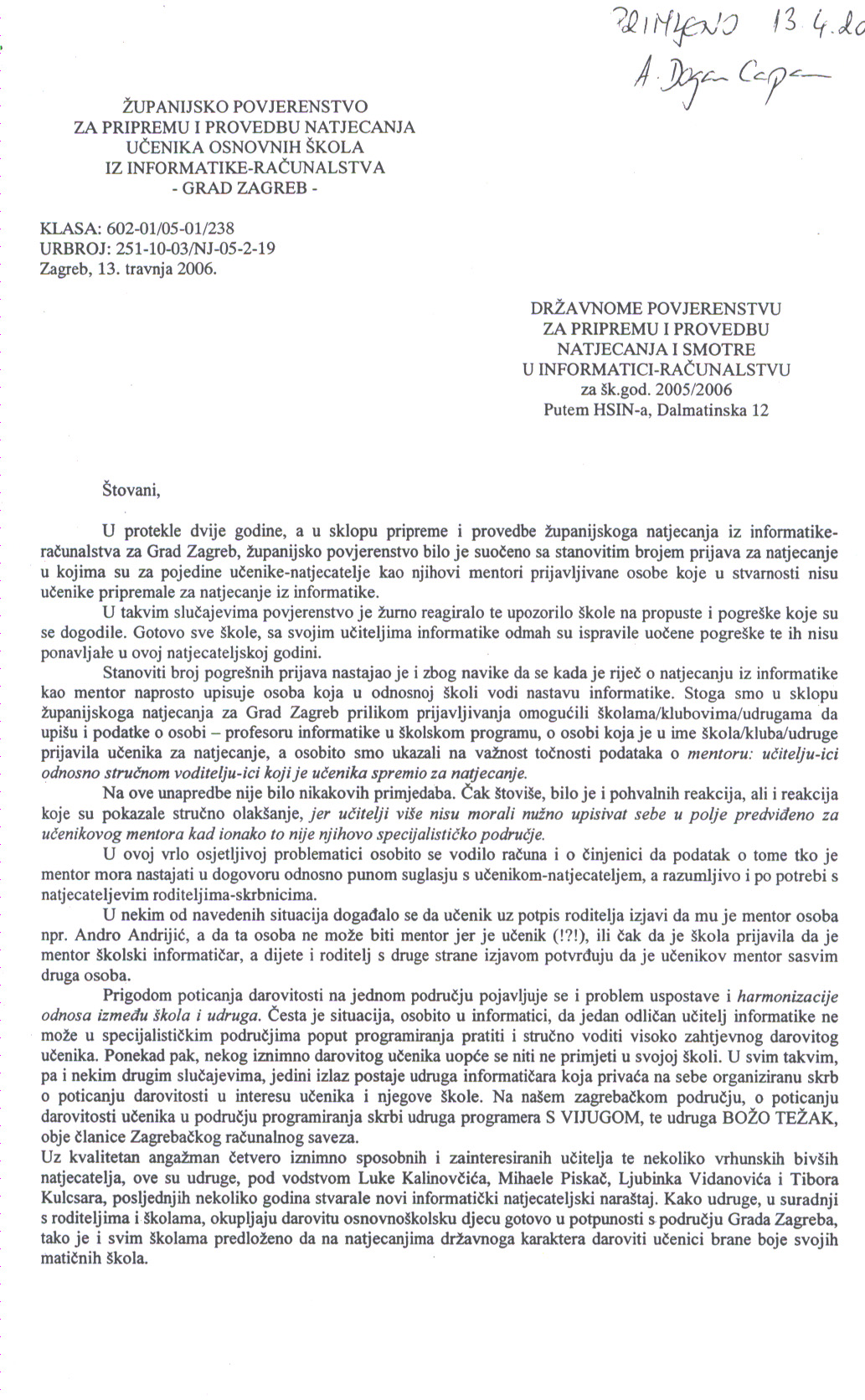 - u dane 6. i 7. travnja naše županijsko povjerenstvo bilo je kontaktirano od strane nekolicine ravnatelja zagrebačkih osnovnih škola koje su skrb o svojim darovitim učenicima, a u dogovoru s učenicima i udrugama Zagrebačkog računalnog saveza, povjerili vanjskim mentorima.