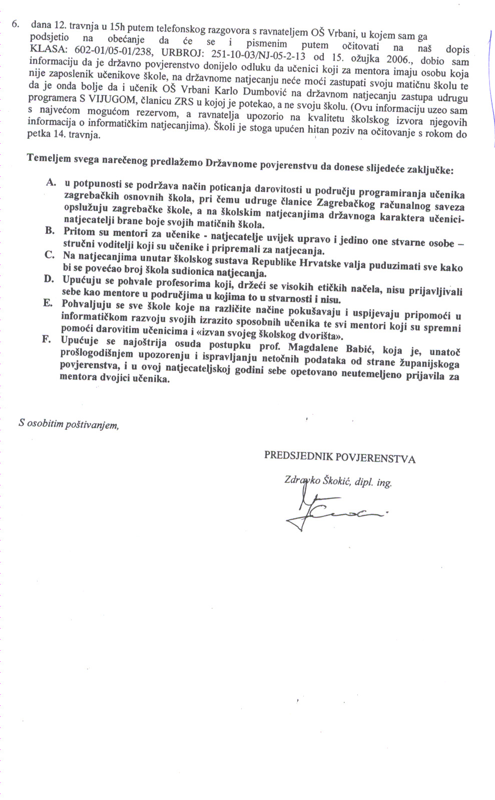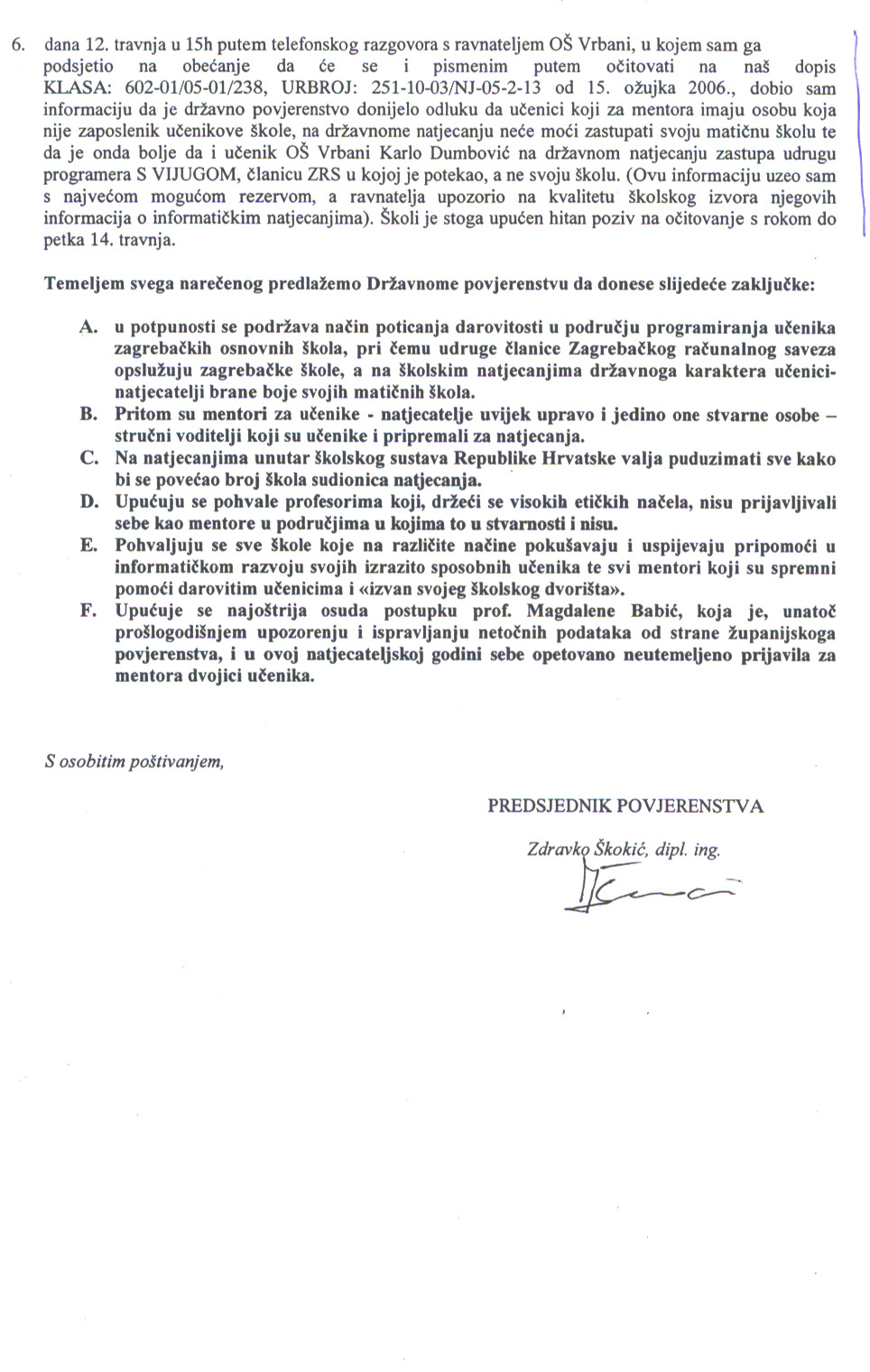 - dana 12. travnja u 15h putem telefonskog razgovora s ravnateljem OŠ Vrbani, u kojem sam ga podsjetio na obećanje da će se i pismenim putem očitovati na naš dopis KLASA: 602-01/05-01/238, URBROJ: 251-10-03/NJ-05-2-13 od 15. ožujka 2006., dobio sam informaciju da je državno povjerenstvo donijelo odluku da učenici koji za mentora imaju osobu koja nije zaposlenik učenikove škole, na državnome natjecanju neće moći zastupati svoju matičnu školu te da je onda bolje da i učenik OŠ Vrbani Karlo Dumbović na državnom natjecanju zastupa udrugu programera S VIJUGOM, članicu ZRS u kojoj je potekao, a ne svoju školu. (Ovu informaciju uzeo sam s najvećom mogućom rezervom, a ravnatelja upozorio na kvalitetu školskog izvora njegovih informacija o informatičkim natjecanjima). Školi je stoga upućen hitan poziv na očitovanje s rokom do petka 14. travnja.