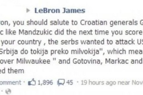 Super zanimljiva priča i nevjerojatne snimke stižu nam iz SAD-a. Glavni akteri su LeBron James i oslobođeni hrvatski generali Ante Gotovina i Mladen Markač... Sve je počelo jučer kada je jedan Hrvat poručio LeBronu Jamesu na službenom Facebook profilu neka se ugleda na Marija Mandžukića i pozdravi hrvatske generale 'jer su ga oni navodno spasili od ...'. Taj simpatično smiješan tekst na FB-u glasi: „Bok Bron. Trebao bi salutirali hrvatskim generalima Gotovini i Markaču kad postigneš sljedeći koš, baš kao što je to napravio Mandžukić. Oni su spasili tvoju zemlju, jer 'Srbi' su htjeli napasti SAD. Njihov moto bio je 'Srbija do Tokija preko Milvokija (Milwaukeeja)'. Gotovina, Markač i ostali Hrvati su ih zaustavili“, napisao je navodno niki naš sunarodnjak LeBronu Jamesu.