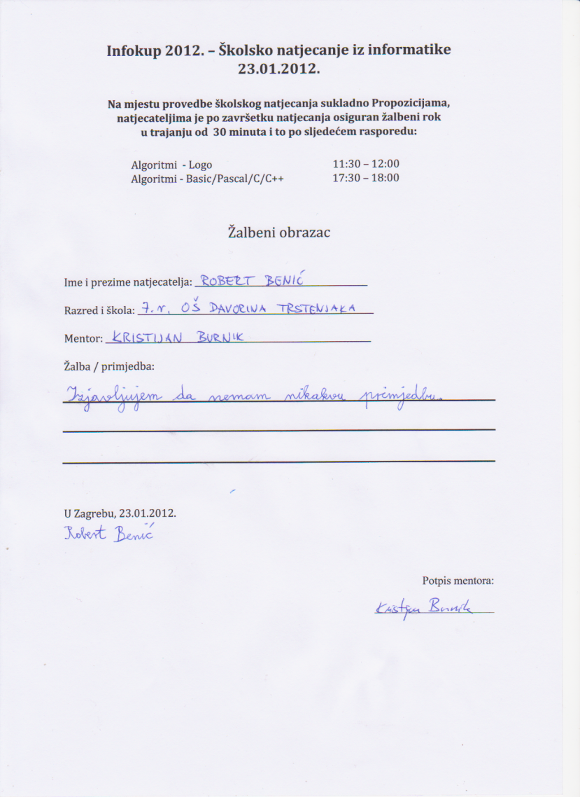 Svi natjecatelji su imali pravo žalbe, nije se dogodio presedan kao prošle godine u OŠ Vrbani, kada je jedan vrhunski natjecatelj u C++ iz 8.r. ostao bez prava na žalbu i dva dana čekao privremene rezultate, i čim ih je dočekao, oni su isti čas postali konačni. Možete si zamisliti da je provedba bila izvrsna jer ni Robert Benić nije našao greškicu pa tako nije bilo ni razloga za žalbu. Ovaj mladi gospodin inače ima odlična zapažanja, i ukoliko su mu pravila potpuno poznata, žali se s razlogom i posve argumentirano i neoborivo.